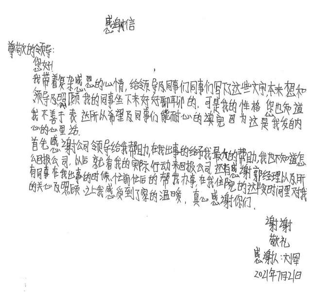 经过半个月治疗休养,刘军手部已无大碍。出院后的他写了一封感谢信并为公司送了一面锦旗,他说道,是天津冠宇社区居家服务有限公司这个大家庭让他感受到了关怀和温暖,他表示要把这种关怀变成工作上的动力,争取早日返回工作岗位,努力工作,回报大家的关心和关爱。